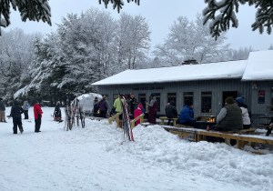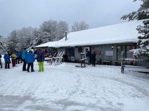Next, I headed up a moderate climb to Trappers Cabin. An employee had just snow-shoed to the location, pulling a sled. He started a warming blaze in the fire ring and set up a stand with Gatorade, juices and water. Many beginners assume that the problem with skiing is staying warm. They bundle up with heavy coats and snow pants, or sometimes jeans. These limit motion, and result in a large build up of perspiration. You then get thirsty and you discover that moisture in the cold is your enemy. As soon as you stop, the moisture starts to evaporate in the dry air and steals your body heat. A warming fire and bottle of water can be a life saver.