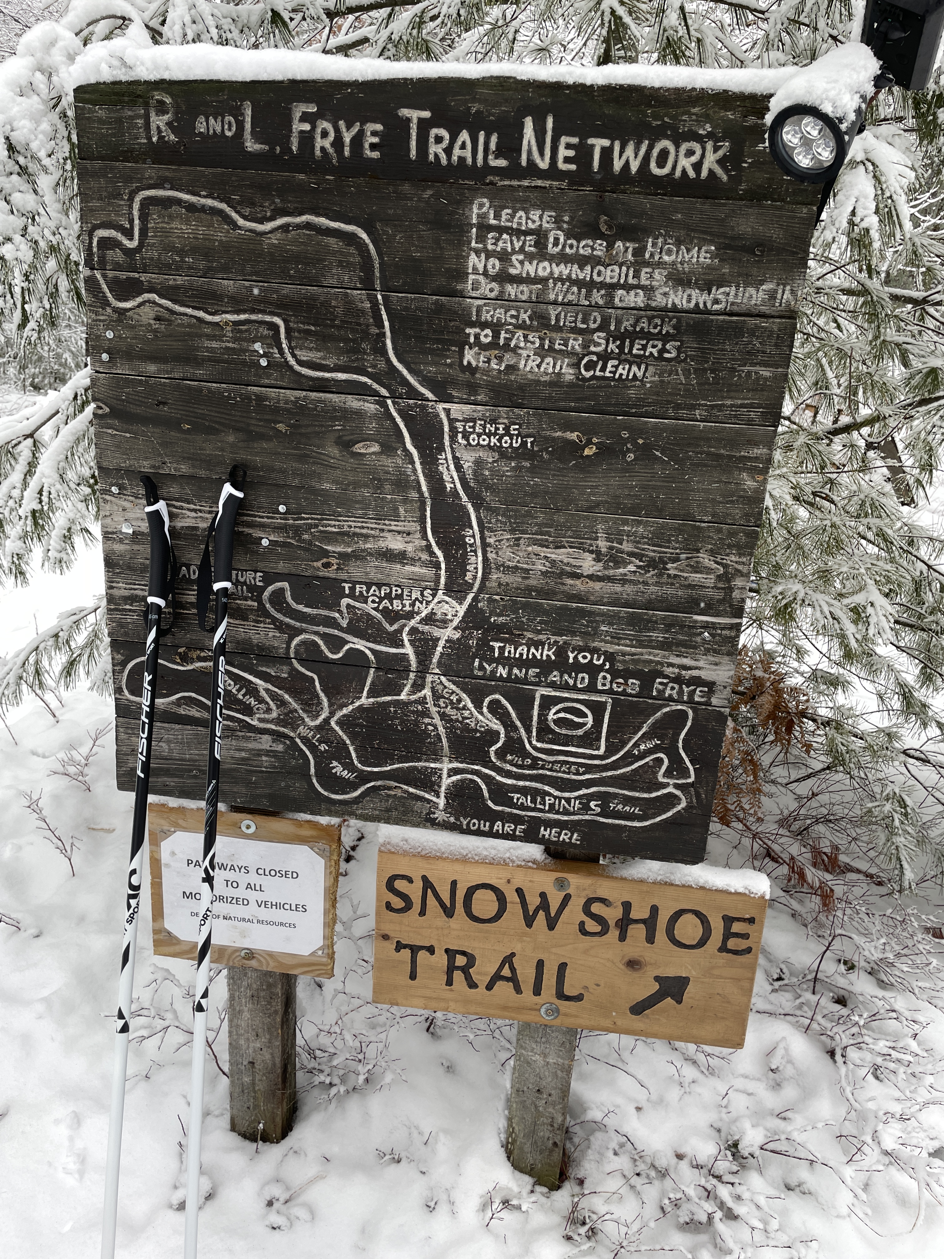 The first loop to the right, Tail Pines, was labeled on the map as “flat”. So, I skipped it. The one on the left, called Rolling Hills, I was not yet ready to try. So, I took the second loop to the right, Wild Turkey. It was a slight up and down course through a couple of open meadows and cave like passages through the snow coated pines. It is a good beginner trail, with 2 or 3 nice easy glides.