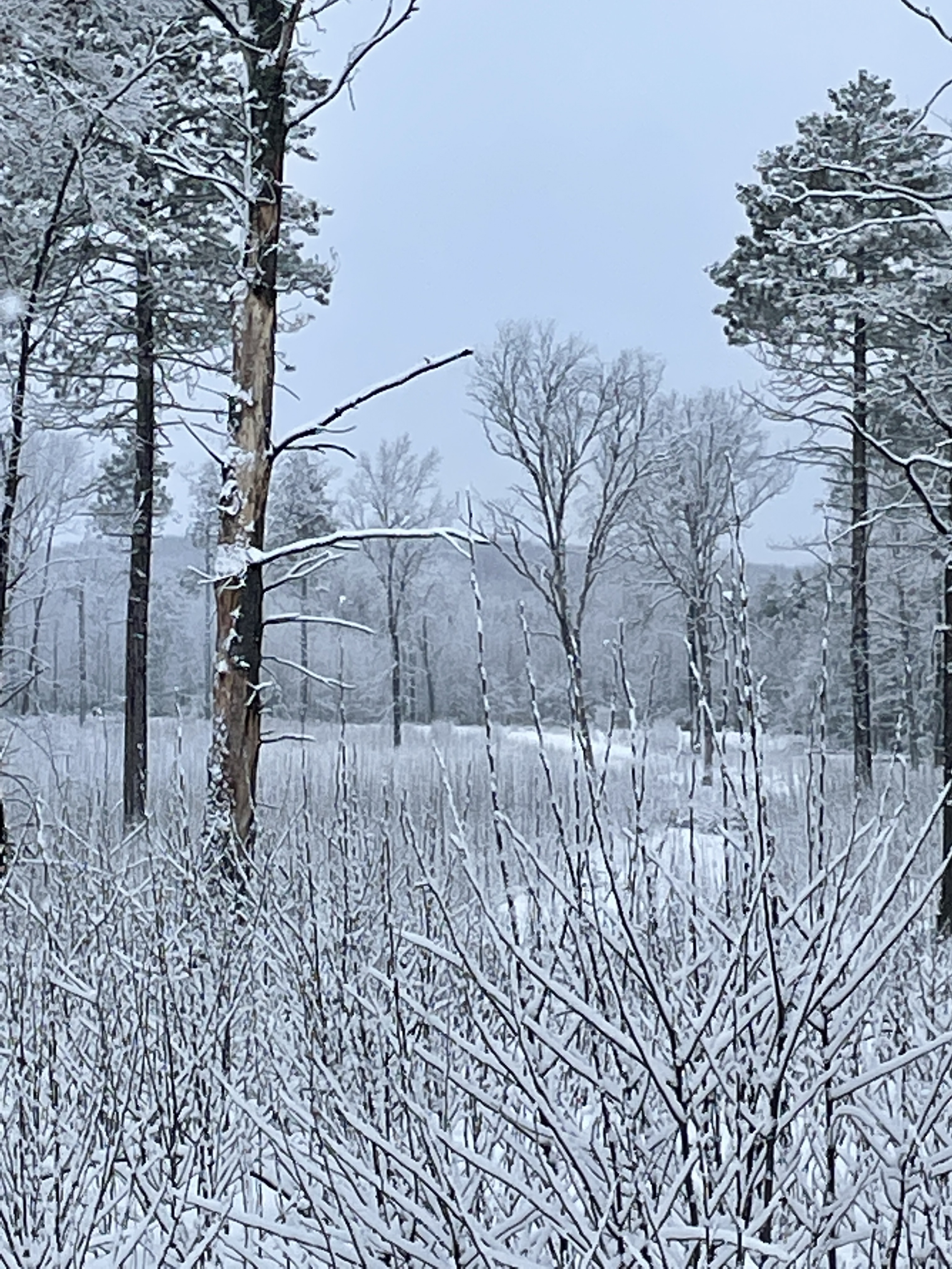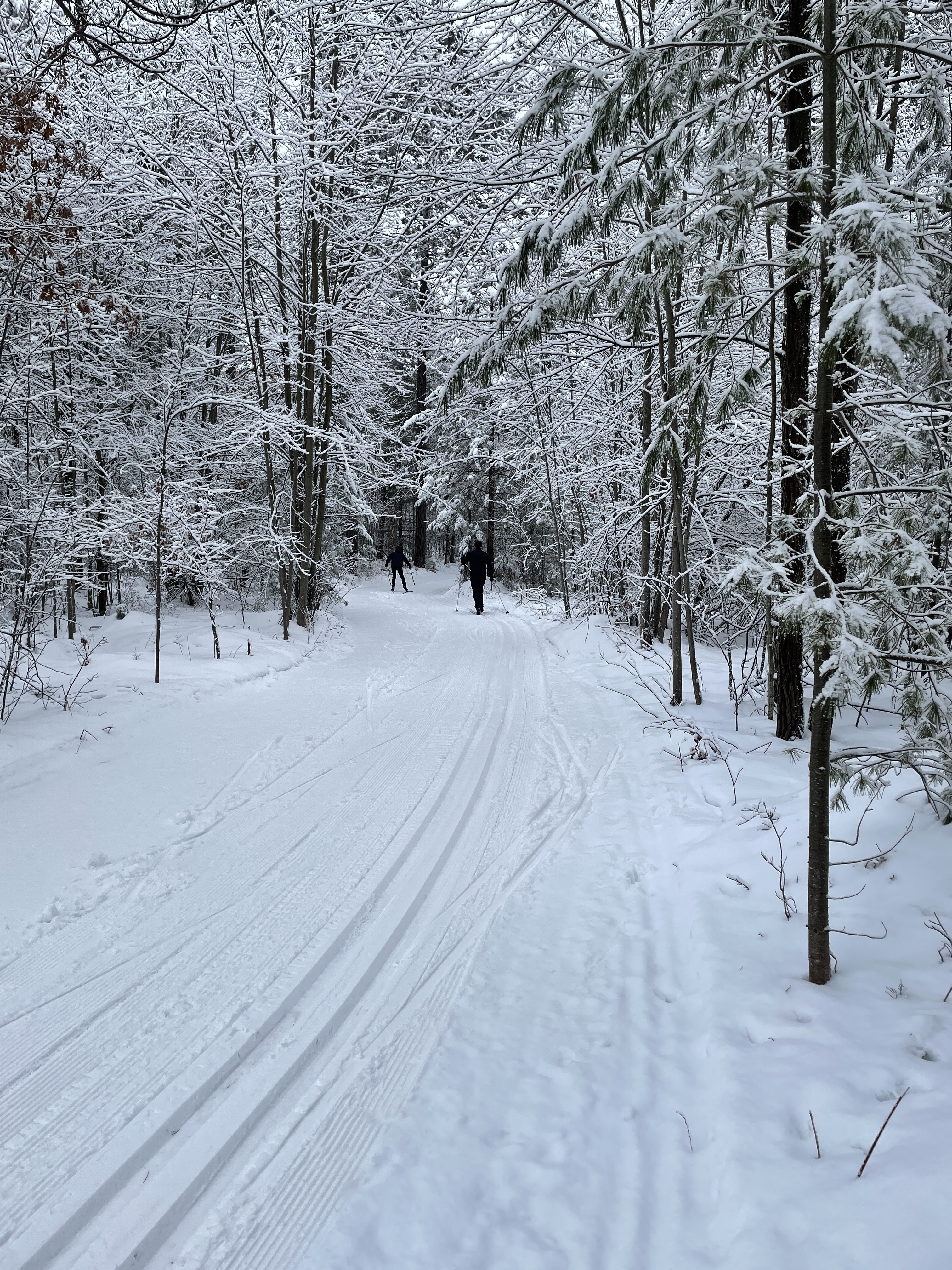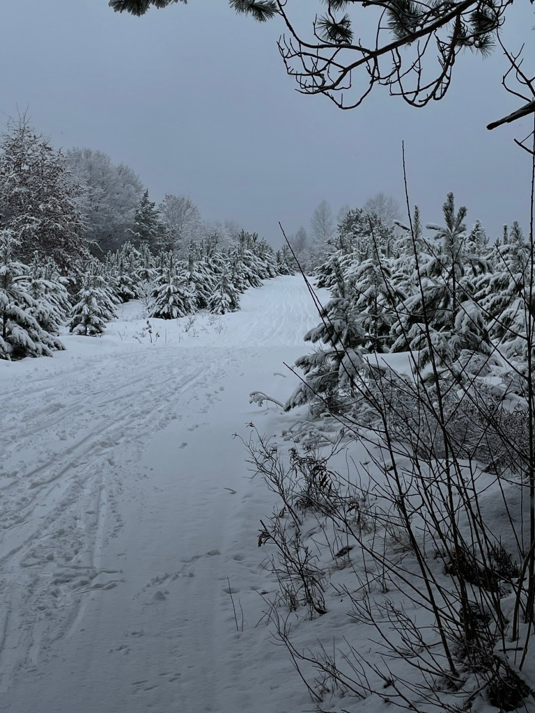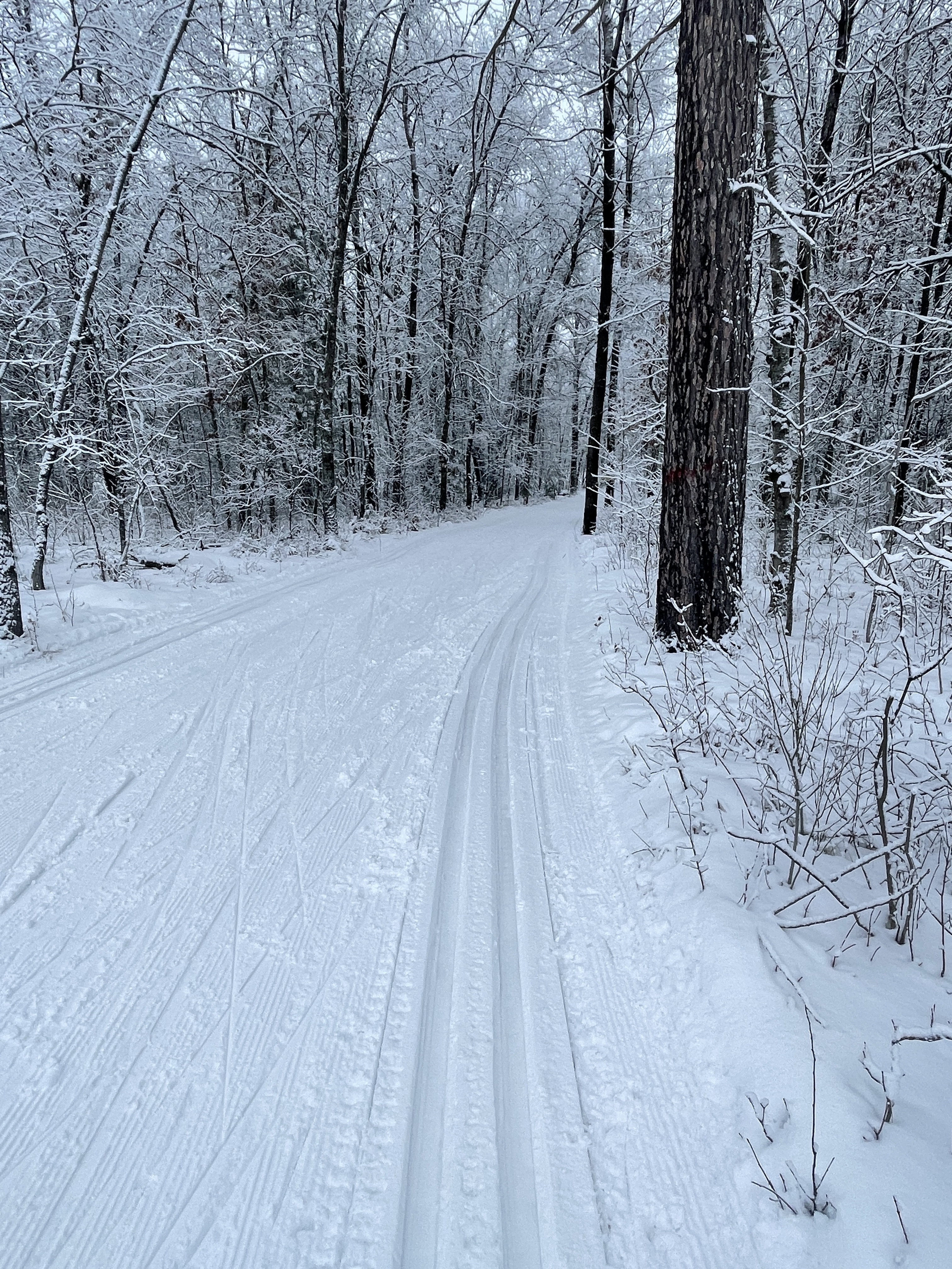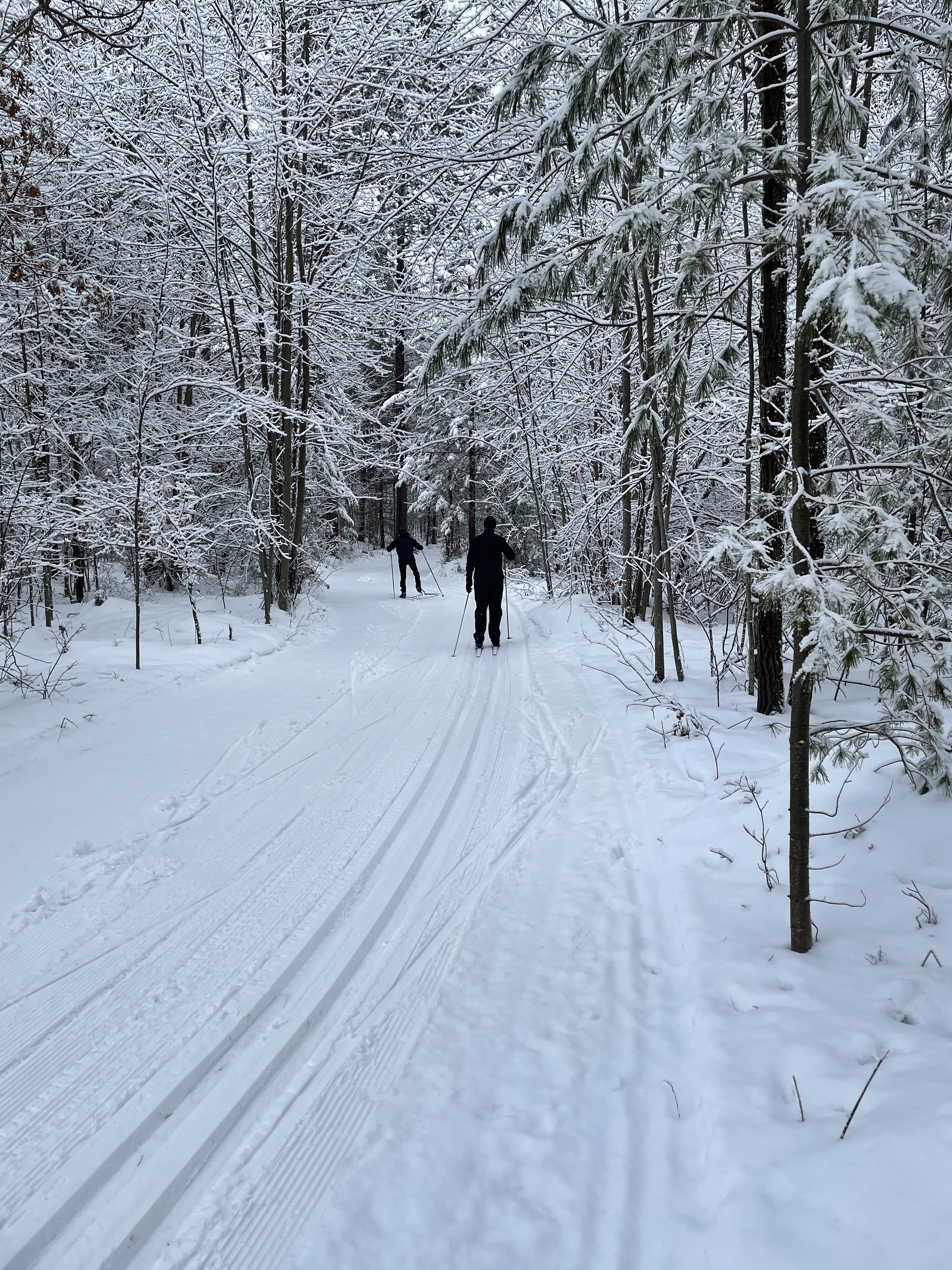 When you recall the best days of skiing from your past, what comes to mind is a fresh overnight snow. One where the snow stuck to everything, turning the forest into a white coated world. There is no breeze, just a dead calm. All sound is muffled by the snow. Whenever you slide to a stop, all you hear is the pulse beating in your ear. Occasionally you might hear a bird, probably a crow or raven. If you see a deer, it is more like an apparition, than a real flesh and blood animal.