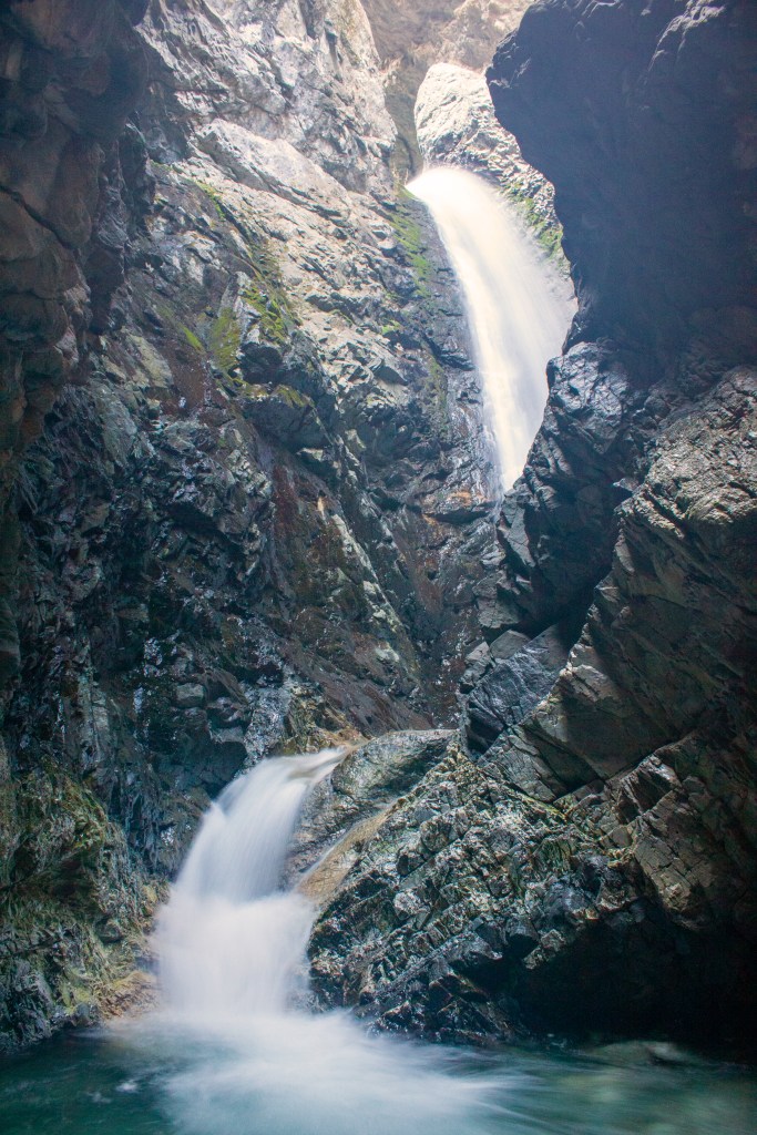 To reach the trailhead to Zappata Falls, you need a high clearance vehicle to climb the gravel road from the main highway up to the parking and picnic area near the crevasse formed by Zappata Creek. Then one must scramble up a very rocky trail and wade or rock hop across the creek a number of times before entering the almost cave like cut in rock where the double fall hides. The walls on both sides of the stream close in tightly, trapping the sound of the rushing stream and making for a very noisy experience.