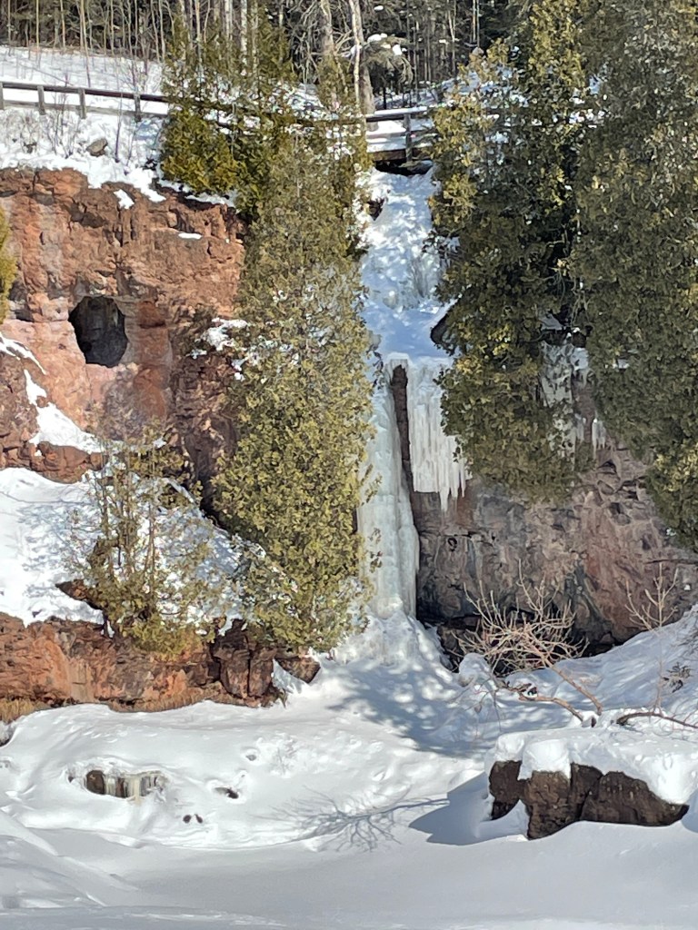 On Saturday I made my way west through Duluth, turning northeast on Highway 61 along the Minnesota North Shore of Lake Superior. I traveled along the scenic route to Gooseberry Falls State Park, where I rendezvoused with Mark, Phyllis and Roger for our first day of skiing. The temperature was in the mid-twenties with a mostly sunny sky and moderate wind. We crossed the river by the snow covered falls and skied the outer loop, northeast of the river. The first part of the route was on a ridge overlooking the partly frozen Lake Superior. Our total distance for the day was 5.2 miles.