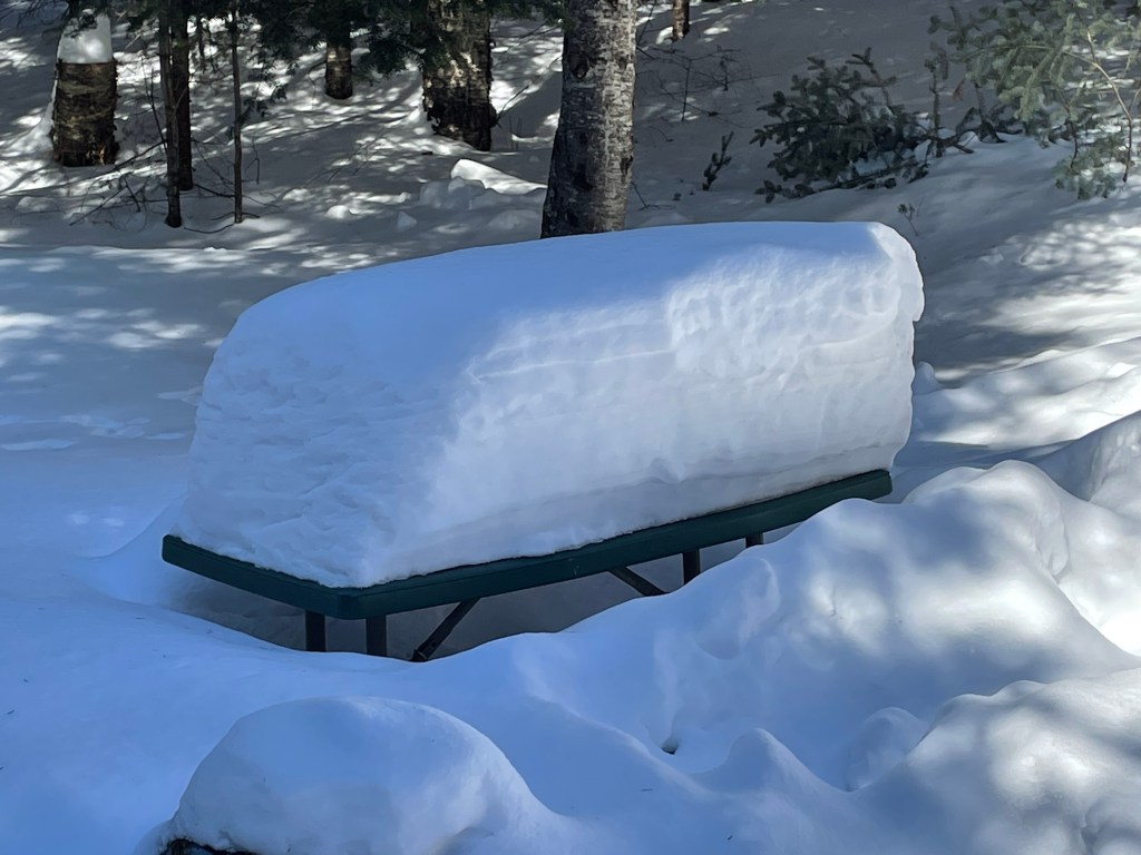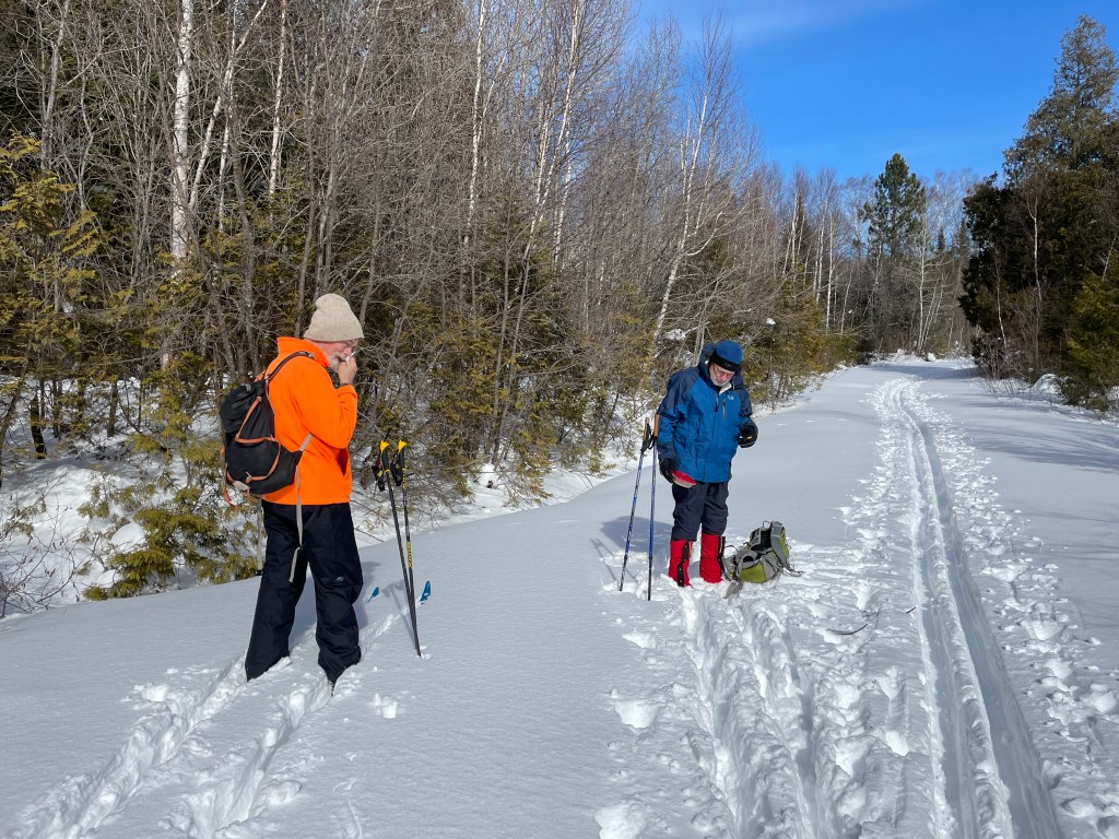 We were back on the skis Thursday and did the Yurt Trail out and back. After resting the day before, I skied my longest distance of the trip, covering 9.6 miles. At the top of a steep hill, I looked down the trail and was met by a Red Fox. He slammed on the brakes once he realized I was a human and darted off the trail to the left. I prepared to go down the hill, but a few seconds later, the fox jumped back onto the trail. He gave me a look as if to say “I want to use this trail, go away”. I couldn’t blame him, as the snow off trail was about 4 feet deep. The fox then ran into the woods on the right, and I skied down.