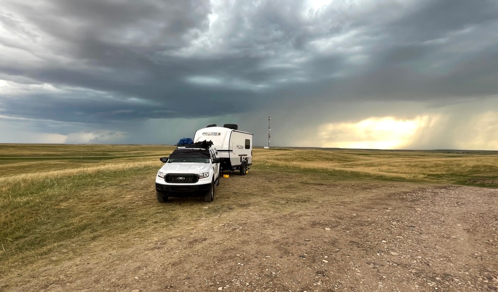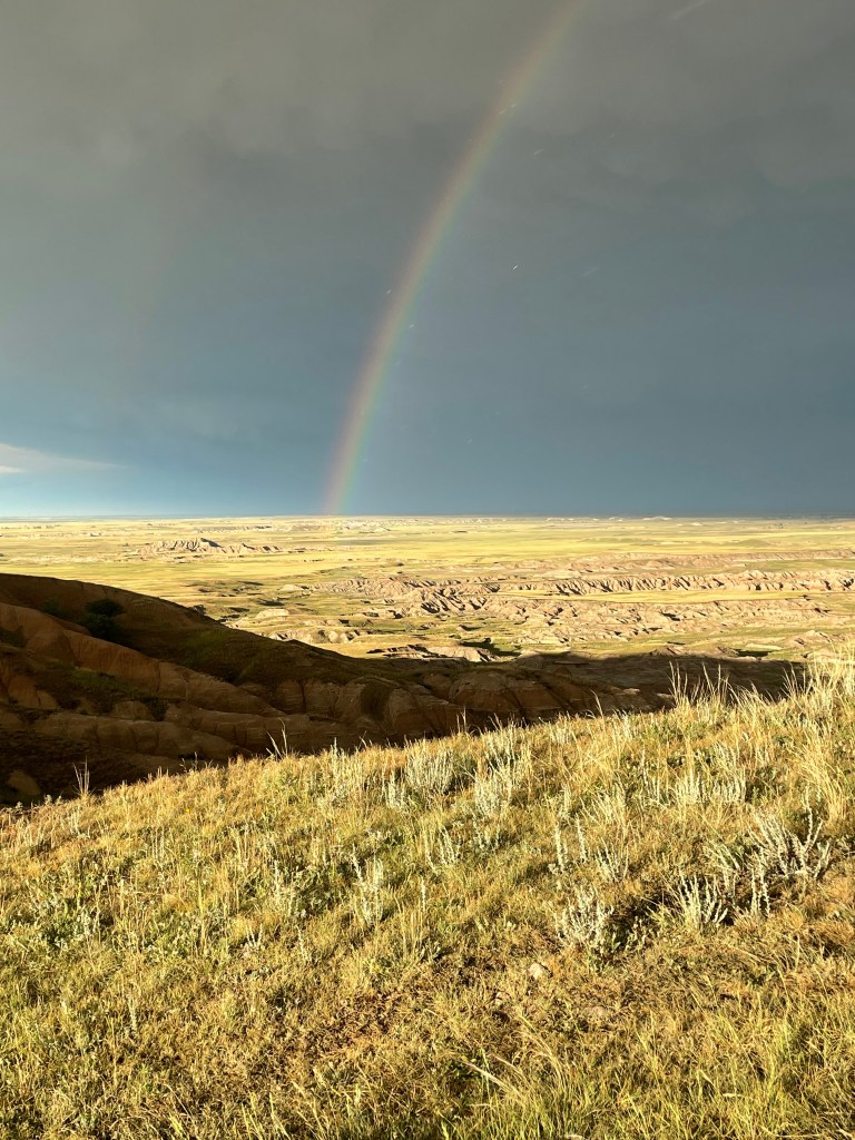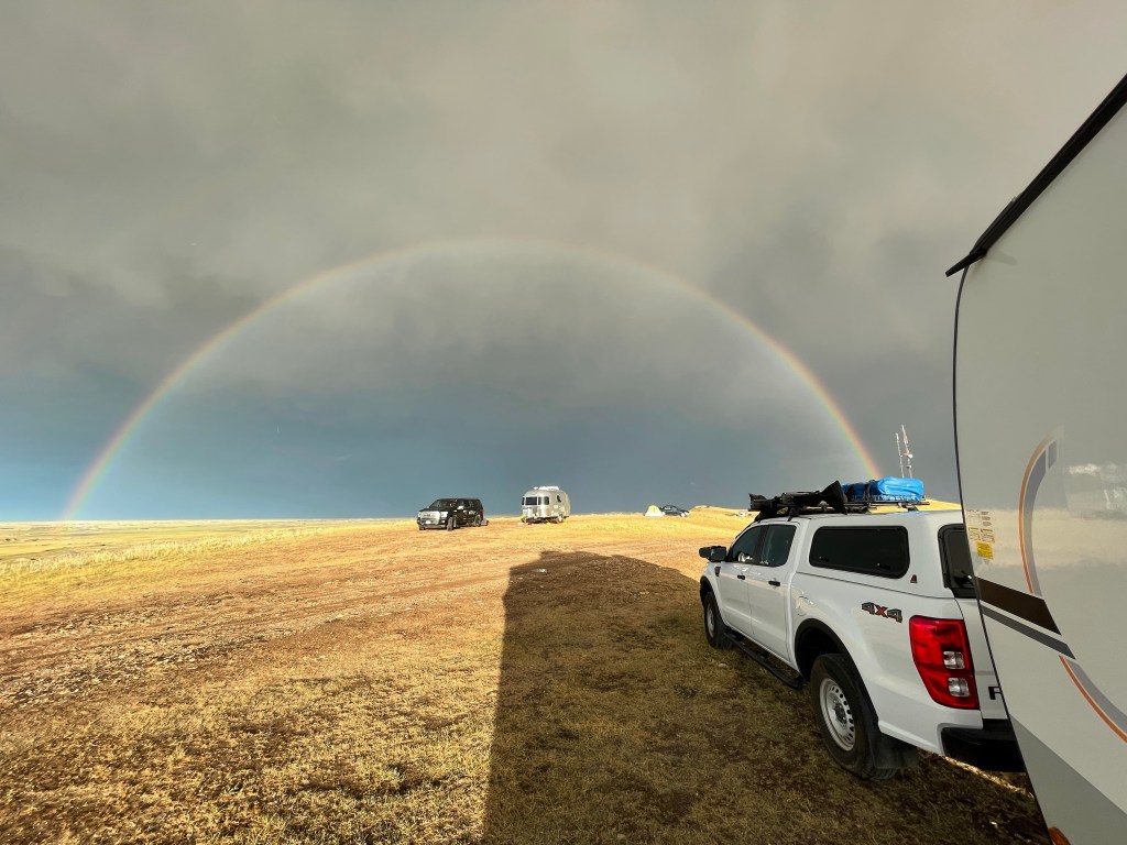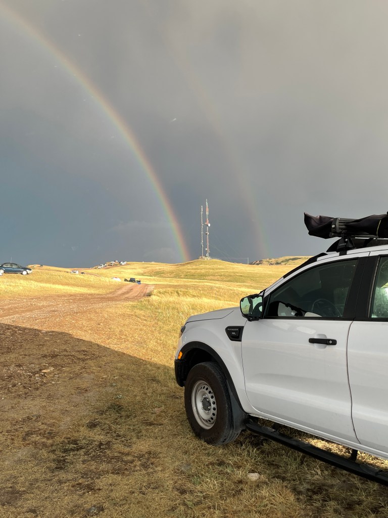 Next I headed into the National Park to find a dispersed campsite. I found one on the ridgeline with a view into the badlands just in time to watch an incoming thunder storm. On the plains you can see for many miles and it took over an hour for the storm to approach. Once it passed, a double rainbow appeared.