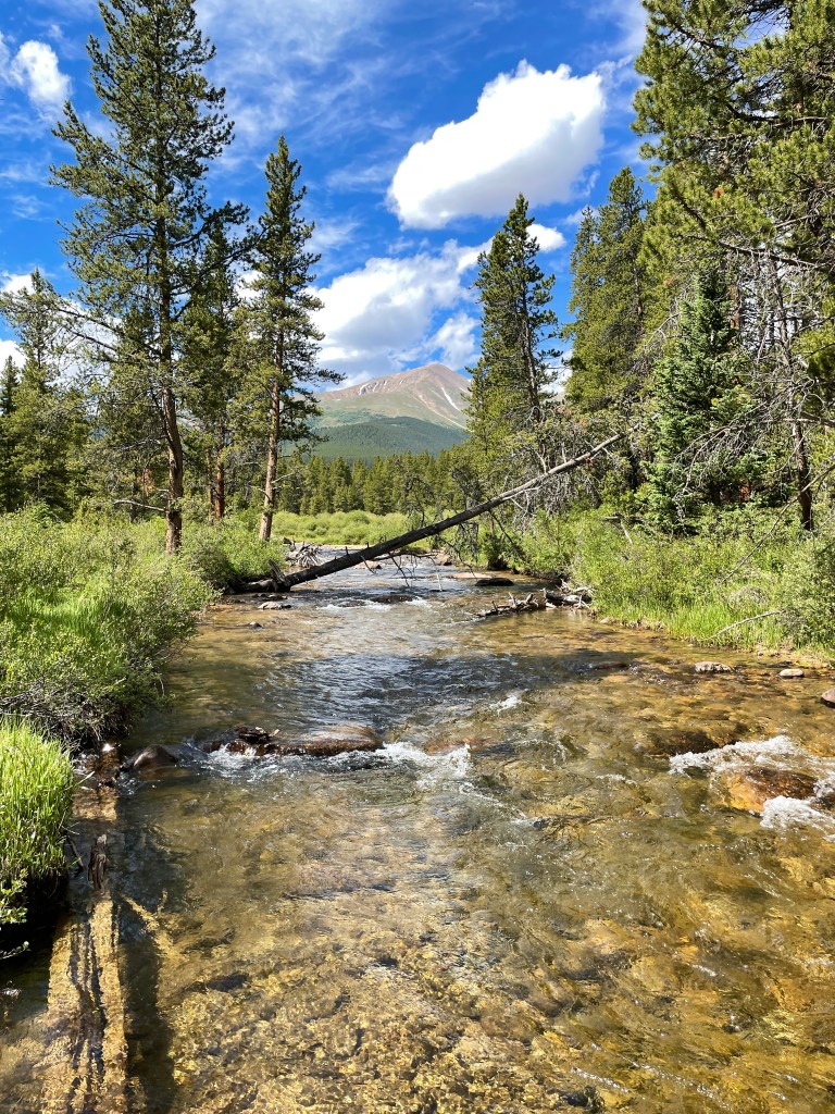 I have spent the last week in the Pike and San Isabel National Forest’s Sawatch mountain range. My site is about 100 feet from Halfmoon Creek whose source is further up the valley between Mount Massive and Mount Elbert, two peaks over 14,000 feet tall. I am at just over 10,000 feet. It is July, and I can see snow on the mountain sides above the forest. The trout stream is fast and cold and full of Brook, Brown, and Rainbow trout. Pine trees surround me and their scent permeates the cool, dry air. Temperatures are in the 40s or low 50s at night but warm up into the 60s during the day. There are a few other campers here, most coming up for the weekend. There are mule deer in the area and hummingbirds buzz by. If you wear red, they think you are a big flower. Canada and Stellar jays stop by once in a while to check for dropped crumbs. and uneaten food.