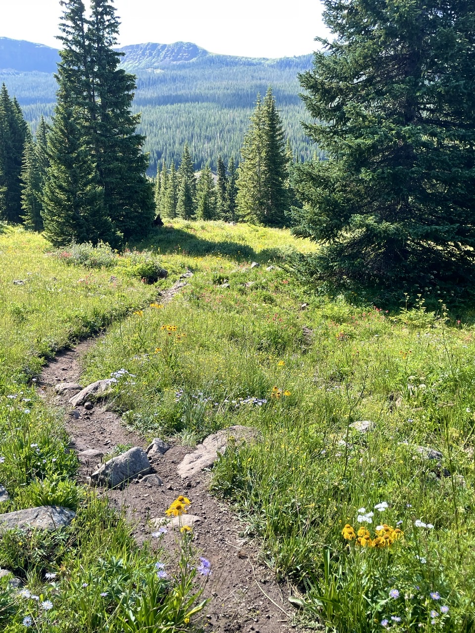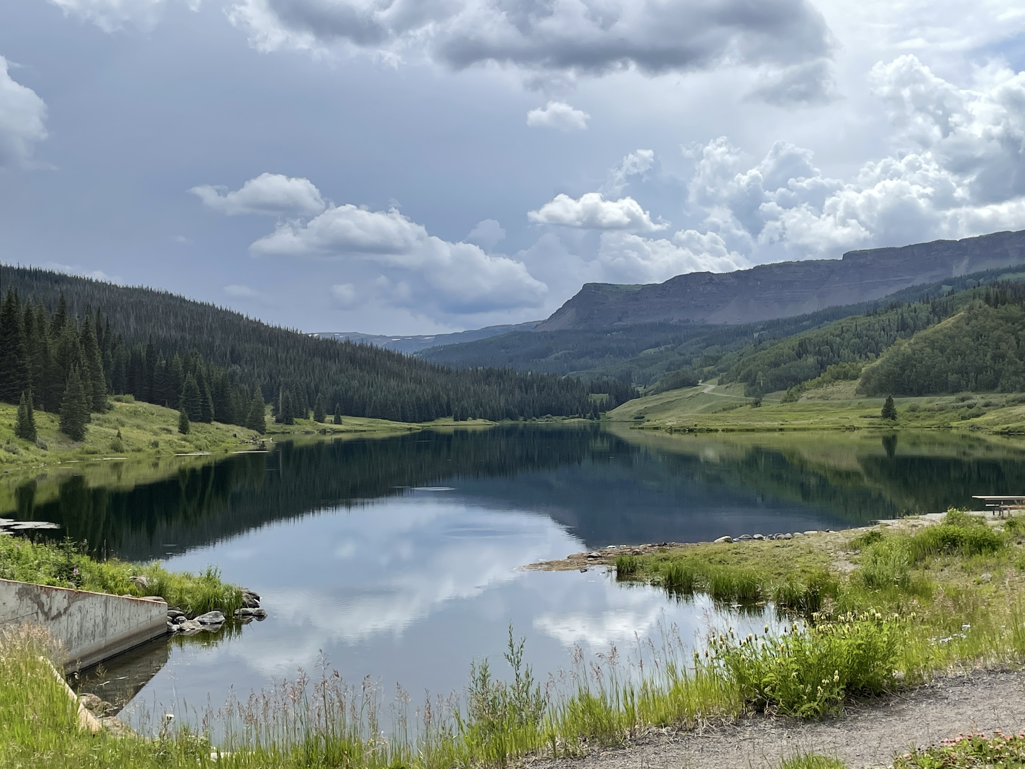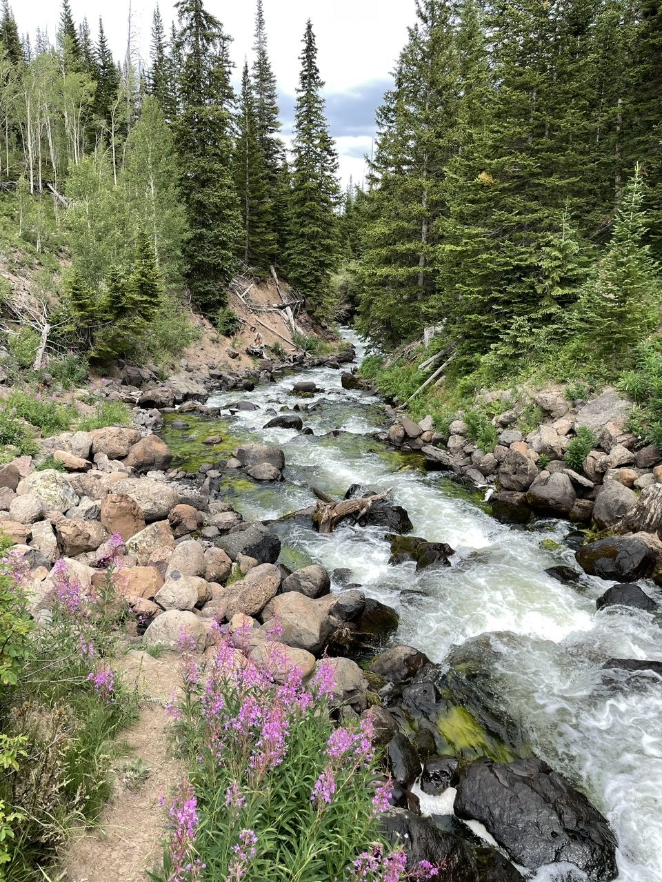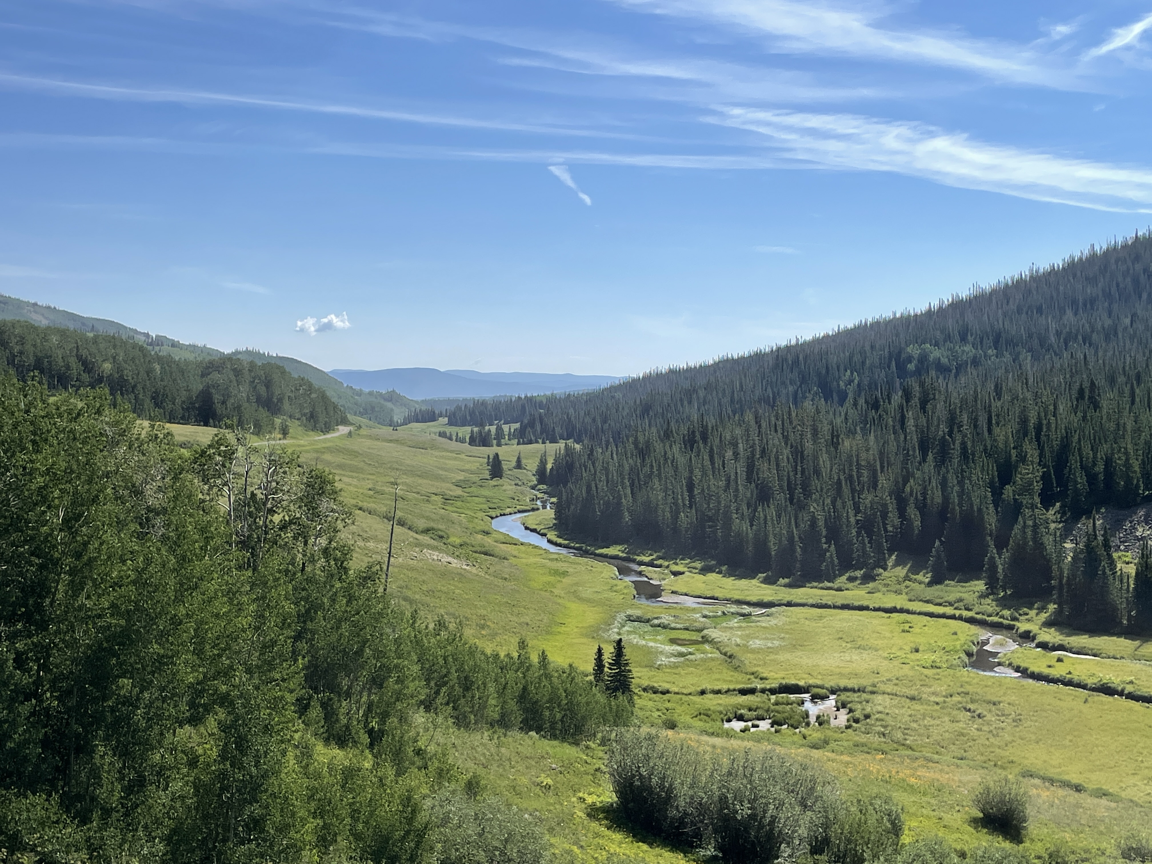 This day, I set up in a new campsite, high in the Flat Top Mountains of Colorado. The campsite is very nice, in a pine and spruce forest above Bear Creek near it’s outlet from Bear Lake and at the foot of the 12000 plus foot Flat Top Peak. After setting up, I decided to make lunch and read for a while. The sky darkened and a thunder shower passed down the valley. When the rain stopped, I needed to take a break, so I went outside for a walk. Much had changed since I parked the trailer. The air was saturated with the scent of pine, spruce, and wildflowers, as well as the rich, wet, earthy smell of rain. Birds were singing. While at my location it rained, a thousand feet higher, the flanks of the mountain were frosted with snow. The sun trying to peak through the clouds, reflected off the silvery runoff on the flanks of the mountain. I could hear the rushing stream down below, and the colors of the forest, trees, and wildflowers were saturated with tones enhanced by the diminished lighting. While standing there watching with wonder, a dark shape flew just over the treetops. I could hear the hissing of air through primary feathers as the large black, white headed bird passed over.