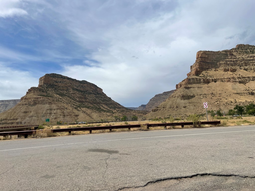On my first morning on top of Grand Mesa, I planned to head down to the town of Mesa to set up General Delivery at the Post Office. I need to have my mail keep up with me. There is also a small grocery there for a food re-supply. However, no sooner had I left the campground than I noticed the PSI warning light for a rear tire. It was down from 38 to 20 overnight. I discovered a large screw in the tread. Fortunately, I purchased a 12-volt compressor before leaving Michigan, so I pumped the tire back up and ran an hour’s drive west to Grand Junction and the tire store to have it patched. I went to O-Tires. They fixed the tire and charged me nothing. Of course, it did cost about 12 dollars in fuel.