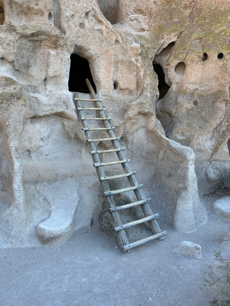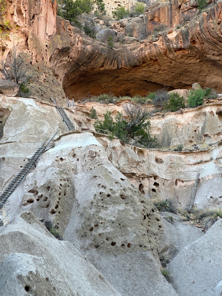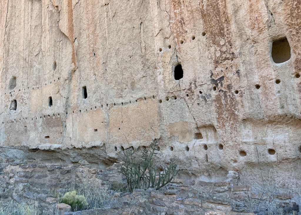 The next morning, Tuesday the 11th, I drove down to the Visitor Center and hiked the main Pueblo loop which followed along the base of the cliff forming one side of Frijoles Canyon. The creek running down through the narrow canyon runs into the Rio Grande River. The cliffs are formed by Tuff. This is a compressed form of volcano ash that was deposited millions of years ago. It hardens and then when the continent was uplifted, it was subject to erosion by wind and water. Pockets of various sizes covered the walls of stone. In the period from 1100 to 1500, native Americans took advantage of these holes and alcoves as shelter. Horizontal post holes were also dug into the walls, allowing timbers to be inserted that would support expanded lodging outward and up as much as 4 stories. It is estimated that the immediate area supported a population of 500.