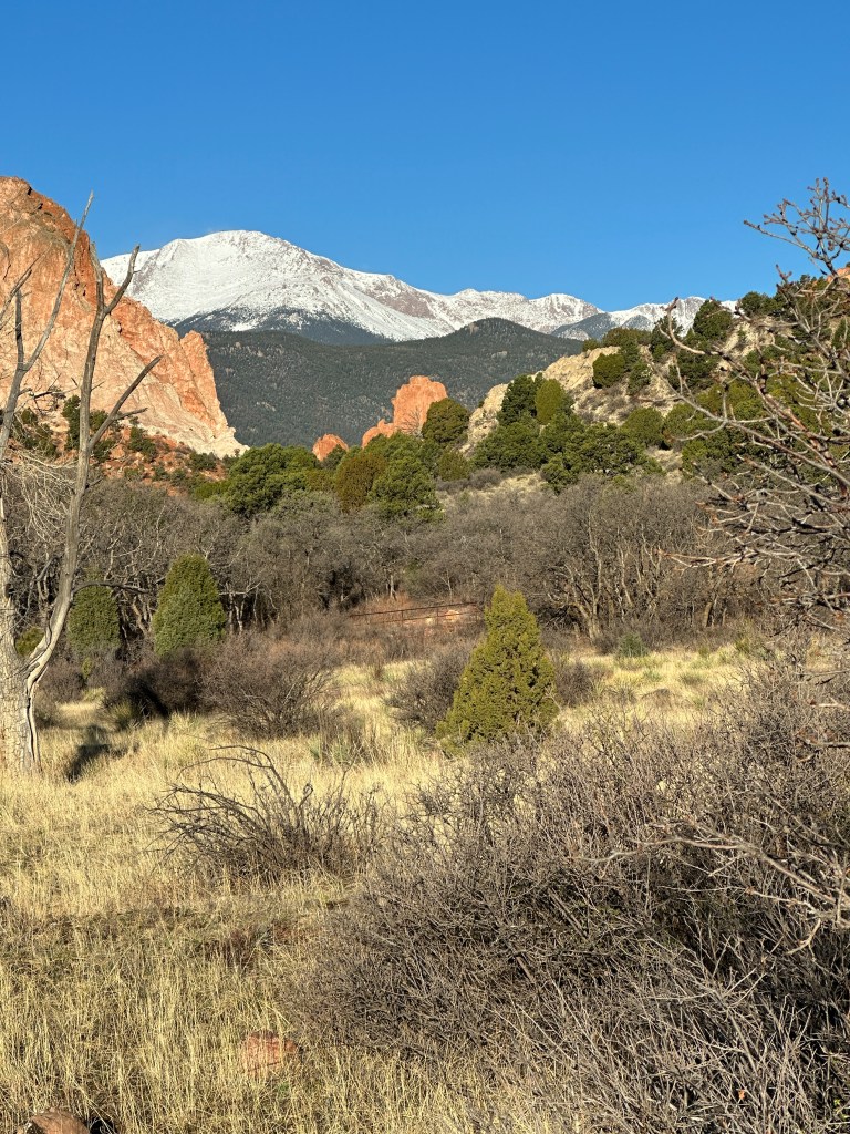 The trails are well maintained and the geologic formations with a backdrop of snow covered Pikes Peak were remarkable. I hiked the main loop, about 2.25 miles, as I was still nursing a sore leg.