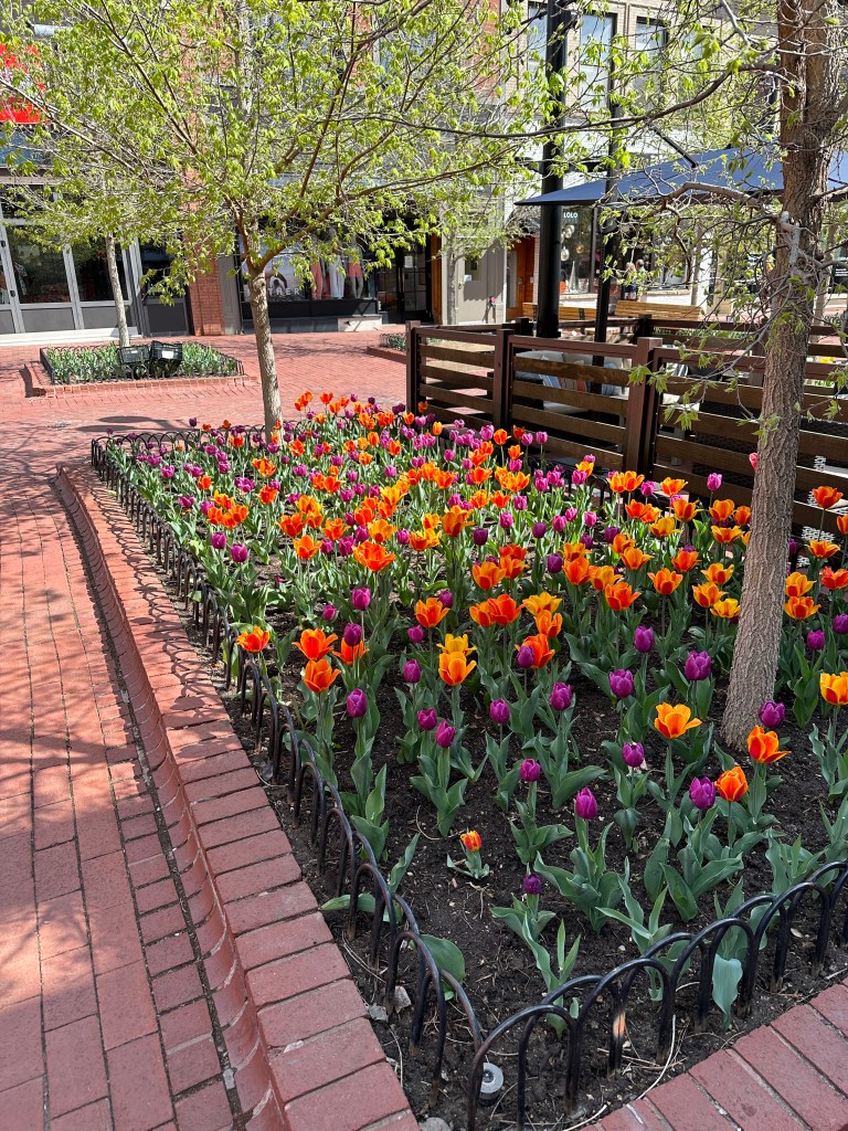 After the tour, Tyler went to work, and I drove over for a walk up and down Pearl Street. The street is now a walkable mall. Freshly planted Tulips and Pansies decorated the street.