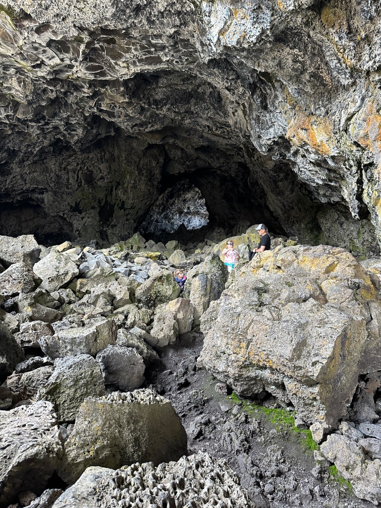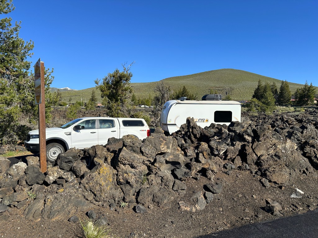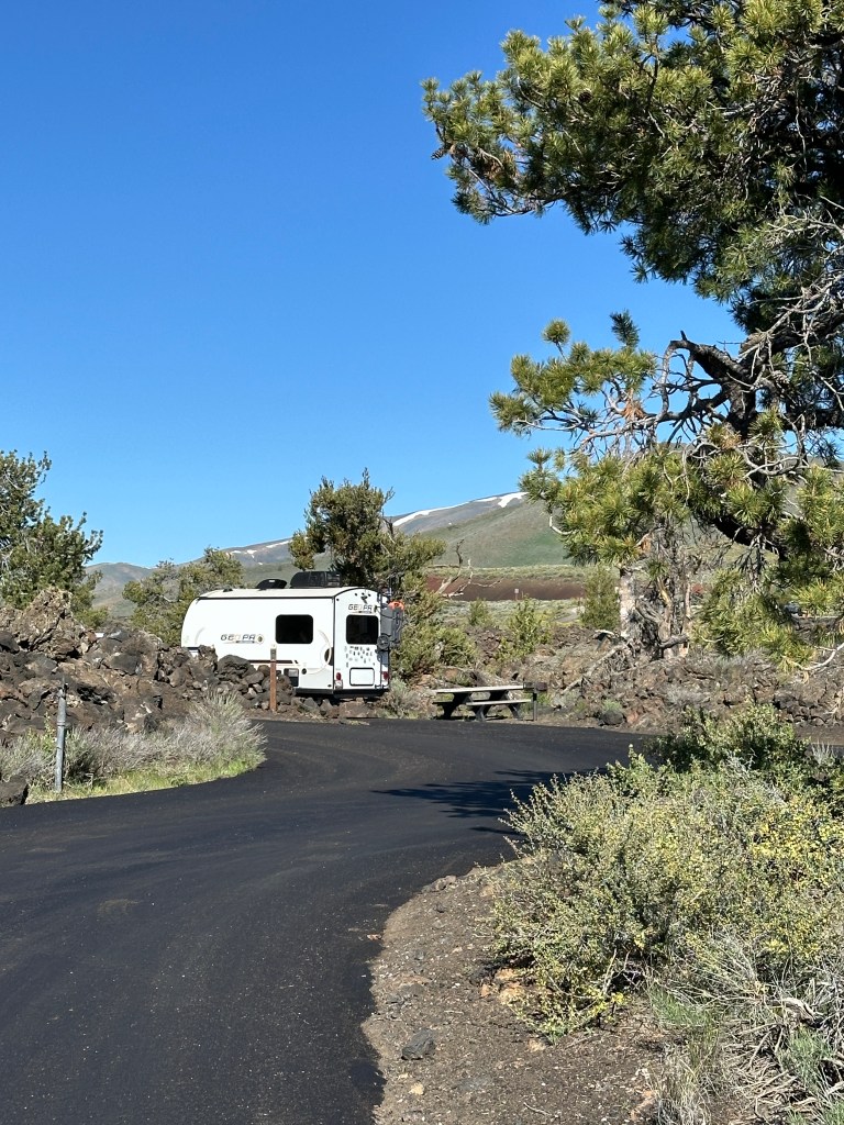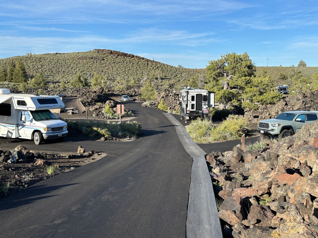 The campground was a paved loop of asphalt winding its way through this rubble. Each site was separated by shoulder high piles of volcanic chunks. It looked like a million dump trucks had unloaded coal here. A few scraggly Juniper trees gave a tiny amount of shade. Many were dead and twisted, giving you the feeling of ogres watching from every direction.