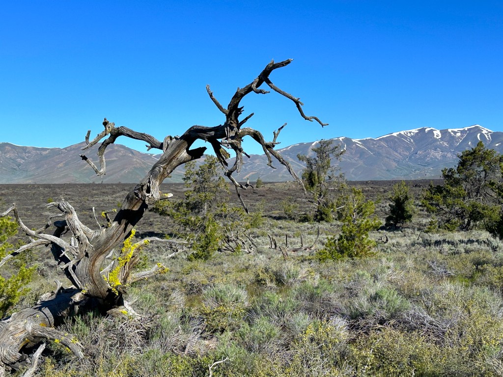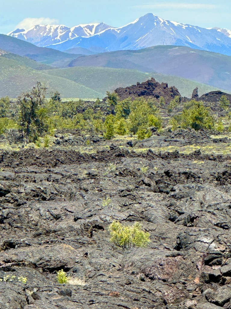 Across the highway to the left were the southern most peaks of the Salmon River Mountains. They were not forest covered, but rather covered by grass and sage. There was still snow on the very tops of the peaks. From a distance the slopes appeared smooth and green, almost like velvet. Then you looked to your right, and the difference was shocking. As far as you could see, was a broken, shattered plain of cracked black rock. This was not typical rock. It was not brown, tan, or gray like most of the stone you see in the mountains. It was a dull black. It was pointed, sharp and rough.