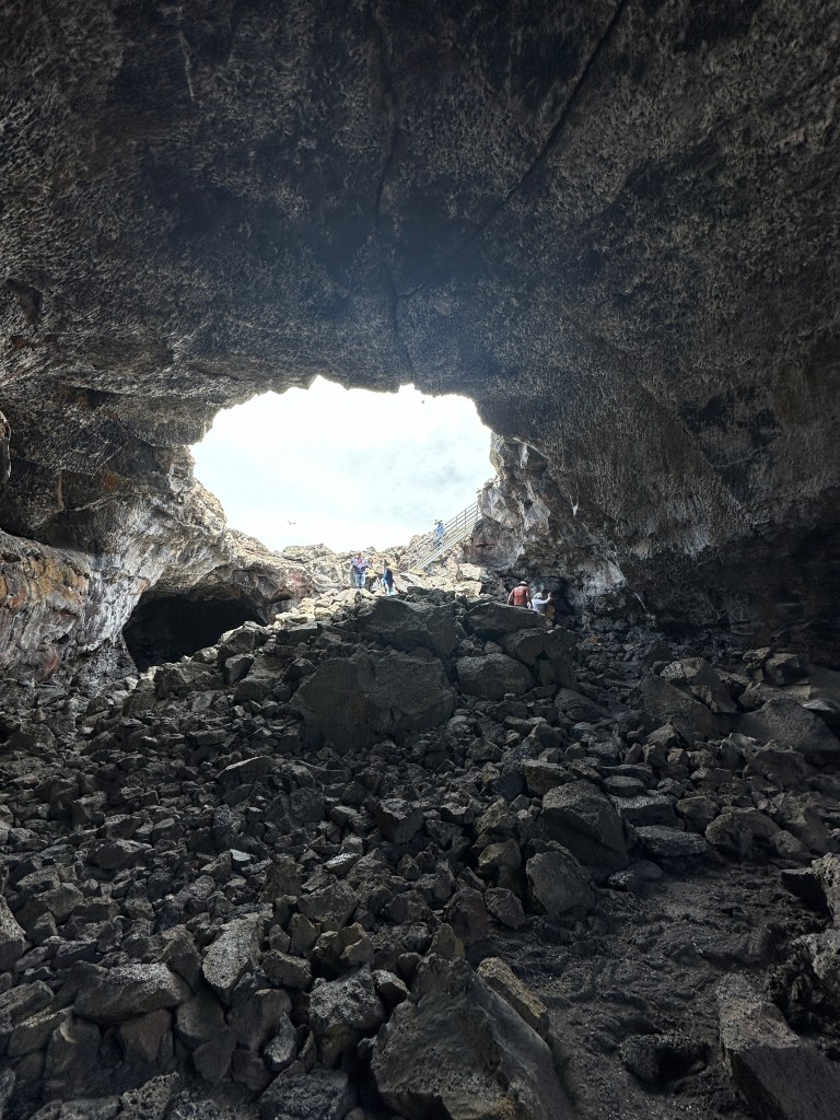 From 6,100 to as recent at 2,000 years ago, this plain was an active volcanic area. Most of the activity was not due to your typical strato volcano we see in pictures. Huge pressures under the crust here uplifted the surface until fissures broke open and spewed lava that flowed down the gradual slopes of the plain. Small cones blew cinders high into the air, creating what looked like giant ant hills. The flows of lava moved slowly to the south as it cooled, leaving what looks like long rivers of warm black molasses, now hardened in the shape of cascades. It is a very inhospitable environment. Miles of it are now contained in a large wilderness preserve.