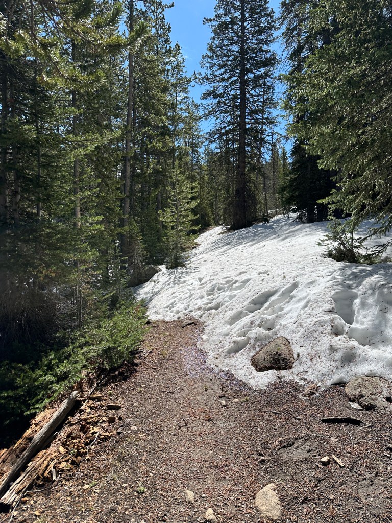 A couple of days alter, I attempted another hike. This one followed a creek up to Fourth of July Lake. It was aptly named, as large snow drifts covered a lot of the trail and after “post holing” through much of it, I finally came to a creek crossing where the rushing snow melt was just to dangerous to cross. So, I turned back. I probably needed to wait until at least the Fourth to try getting to the lake. It was still worthwhile. It was very quiet, with only the rushing sound of the cascading creek, and a few Western Tanagers to keep me company.