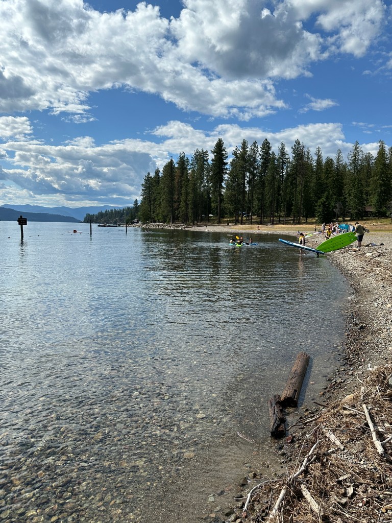 I hitched up and drove through Sandpoint on the way to my next campground on the east side of Lake Pend Oreille (pronounced Ponderay). Sam Owen is a Forest Service campground near the small harbor town of Hope. It is probably the most popular campground in northern Idaho. This is probably due to the large sand and gravel beach and boat launch on the lake. Most campers seem to come for a day or two, and each morning head down to the beach where they can swim, lay in the sun, kayak, and blast their favorite music on a boom box. Fortunately, my site was in the upper loop, so the noise was minimal.