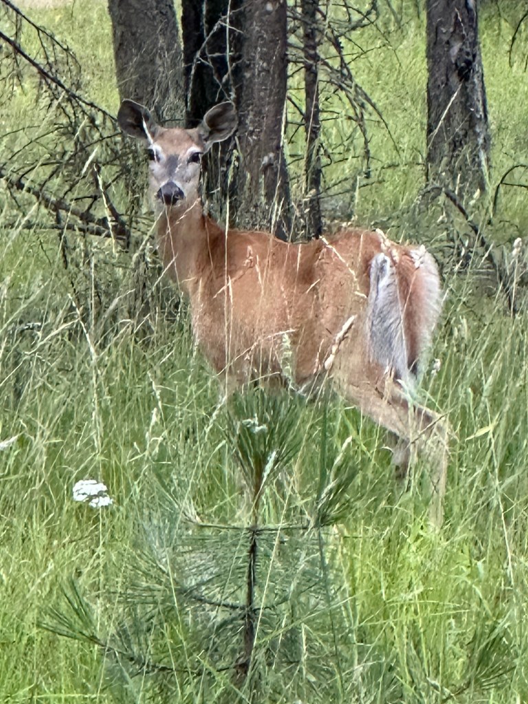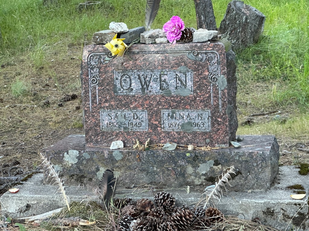 I went on a short hike of the Sam Owens Trail. The park and campground were built on land donated by Sam Owen and his wife Nina back in the middle of the last century. A short way up the trail, is a spur path that goes to their gravesite. The site is on top of a hill and overlooks the lake and mountains to the west. Visitors to the site have left wildflowers, turkey feathers, large pine cones, and slices of apple on the headstone. The apples were consumed by the many deer in the area, who seemed to have little fear of humans. I saw 5 of them while walking, two of which were bucks.