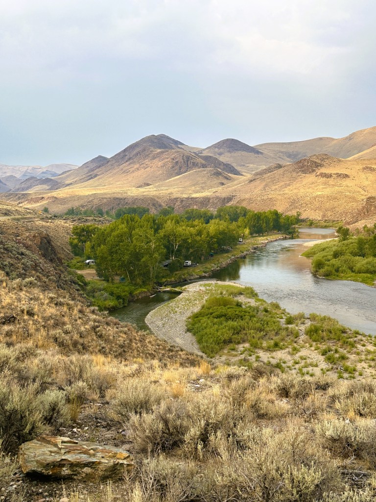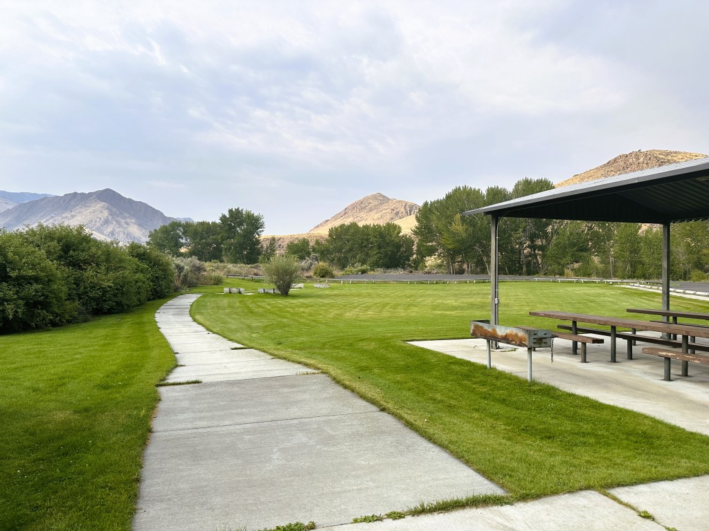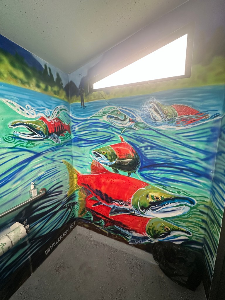 Eventually, I reached my destination at Cottonwood BLM Campground. This is another very nice campground. My asphalt paved site was on the shore of the river and I could here the sound of the water cascading over boulders. After setting up, I walked over to the restrooms and was shocked upon entry of the men’s facility. I have never before seen a mural on the inside of a vault toilet. This was a really nice wrap around scene of Sockeye Salmon and Cutthroat Trout swimming in a river, done by teenager Helen Seay .