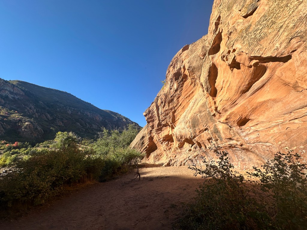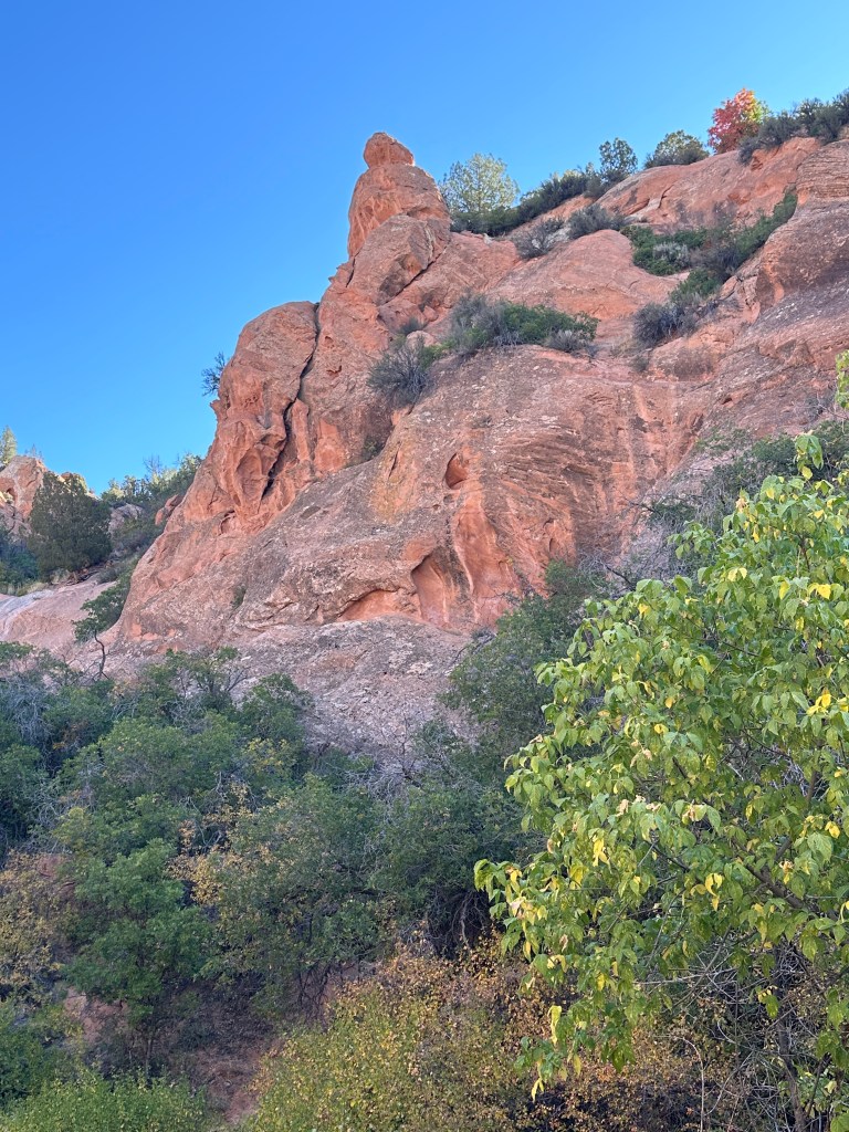 I never experienced more than just a very slight breeze in my nine day stay. That was enough to begin bringing down the red and yellow autumn leaves from the trees and brush. Unlike my years in the Midwest, the fall colors lingered and even increased over many days. It is dry in this area. No blustery, rainy days seem to come along and put a quick end to the colors of fall.