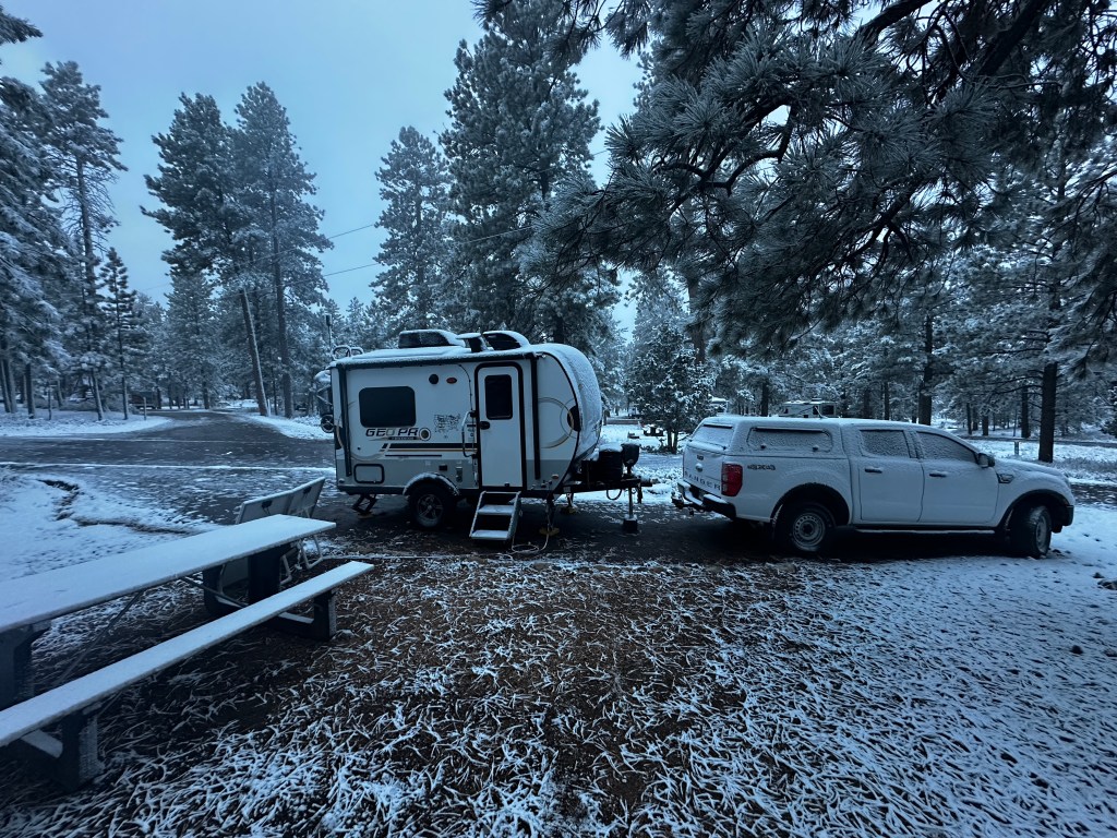 The daily temperature continued to be in the high 60s and low 70s for a week and 1/2. Then a cool front came through and dropped the temperature down to the 40s and 50s. It rained most of one night, and I no longer heard the rain drops on the camper roof around 4 a.m. I didn’t know then, but when I got up to make breakfast, I discovered that 2 inches of snow had come down. The trees limbs were caked with wet snow.