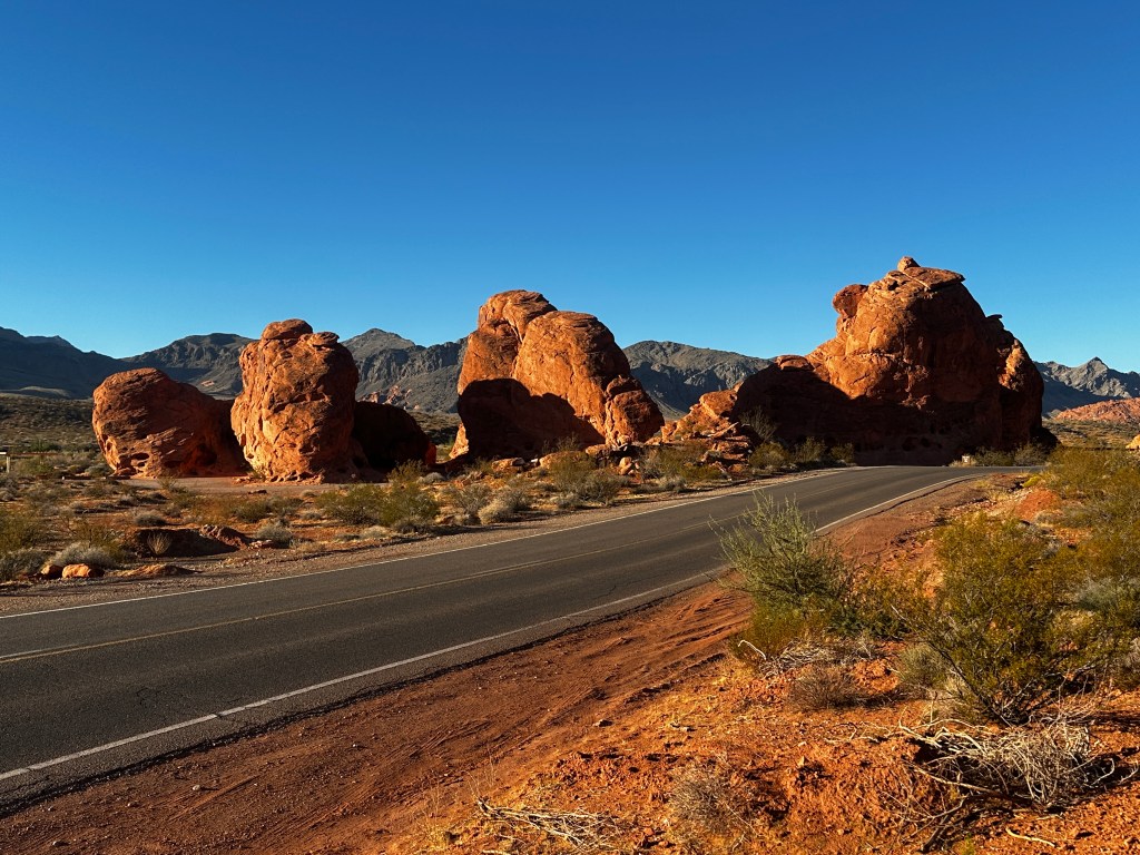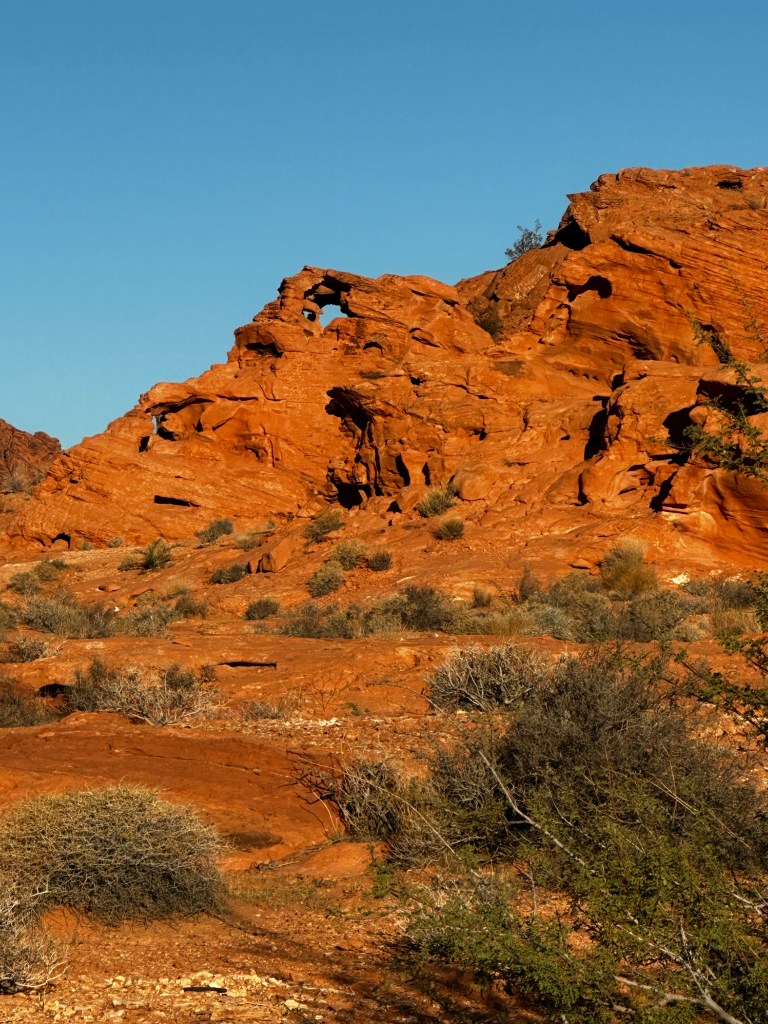 The next morning, I drove a short distance south to the Valley of Fire State Park. This area of Nevada, looks as though a giant force had dropped large piles of red candle wax across the desert. The sun then melted those piles into odd and distorted shapes. Holes and small arches were scattered throughout the landscape. In some places it appeared as if the tops of the piles had melted and sagged over the lower slopes.