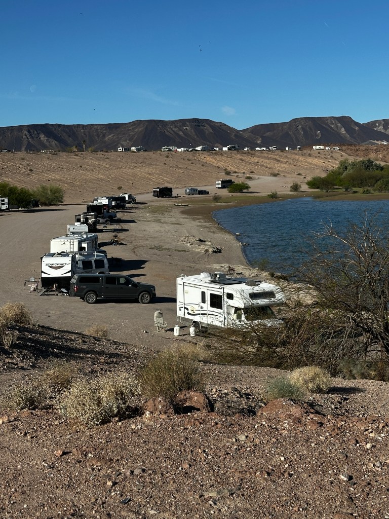 I made a few repairs to my solar system, and went on my usual hikes into the desert and down by the lake. The weather here has been quite warm. It gets down to 50 at night, with very nice cool mornings. By afternoon the temperature warms into the 90s and then cools again near sundown. A group of 42 Gambels Quail run by in the wash each evening and there a large number of wild burros in the area. This morning my neighbor friend texted me that she had almost stepped on a rattlesnake. Good reason to be heading on tomorrow.