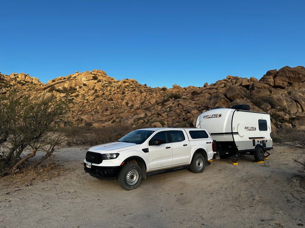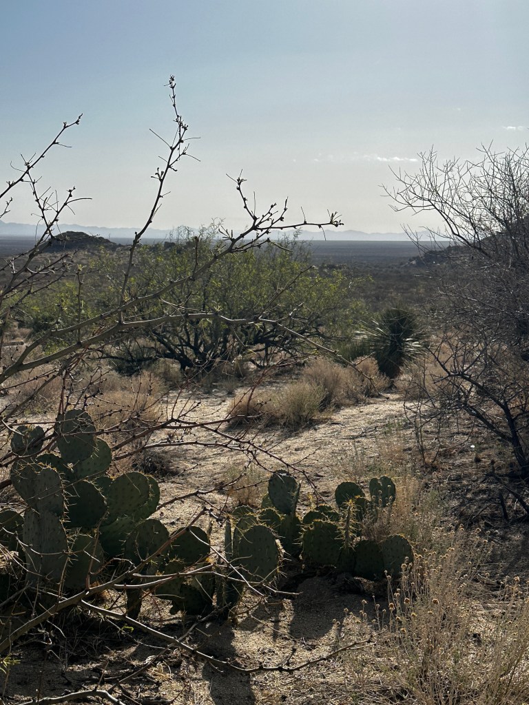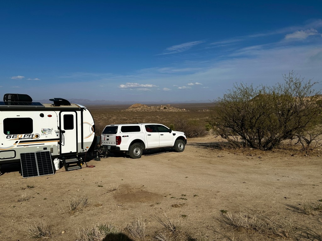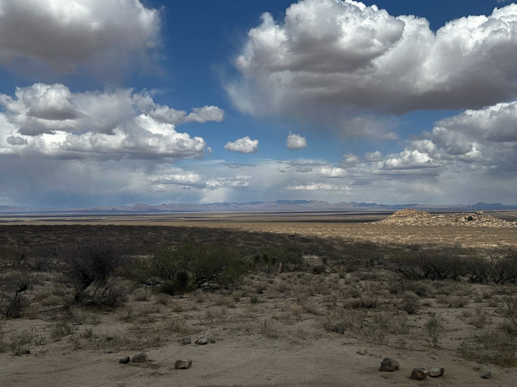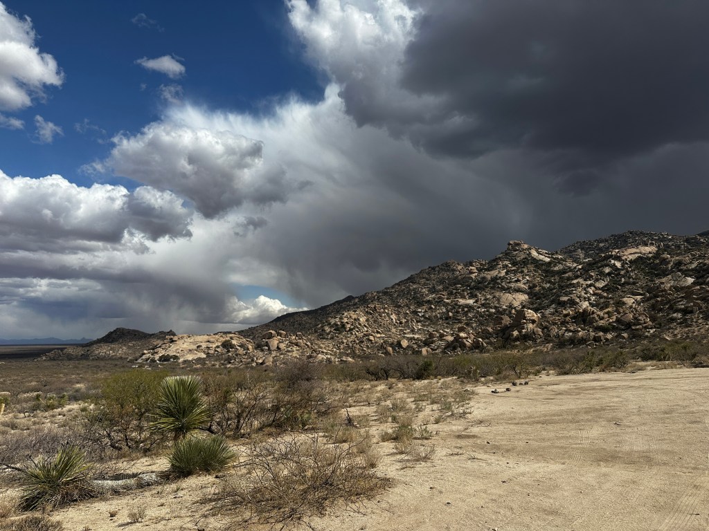 It was very quiet at this campsite. There were a few other campers visible off in the distance. Other than that, there was complete solitude. On Saturday morning, a covey of quail wandered through camp. Once the weather cleared, I could see across the valley floor to the eastward mountain range. In the afternoons, dust devils could be seen miles away. Rain squalls appeared once in a while, but I was unable to tell if any of the raindrops made it all the way to the ground before evaporation. At night, I could see the lights from the small town of Bowie up north at the intersection with Interstate 10. A good 5G cell signal was available, probably from a tower near the same town. Tractor trailer rigs could be seen on the Interstate, slowly moving eastward, always drawing me towards my next destination. I had climbed since leaving Yuma, now camped 4,000 feet higher. I am not yet in the true mountains, but getting close.