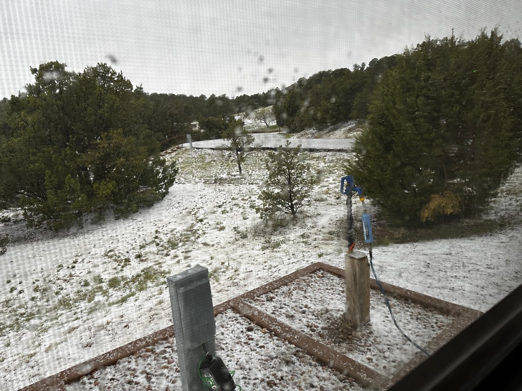 I am now further to the north and have left the spring heat of the desert. Temperatures at night were down in the low 40s and during daytime it was anywhere from 56 to 72. There was even an inch of pea size hail one afternoon. There was also a new sound. Raindrops hitting the roof of the camper.