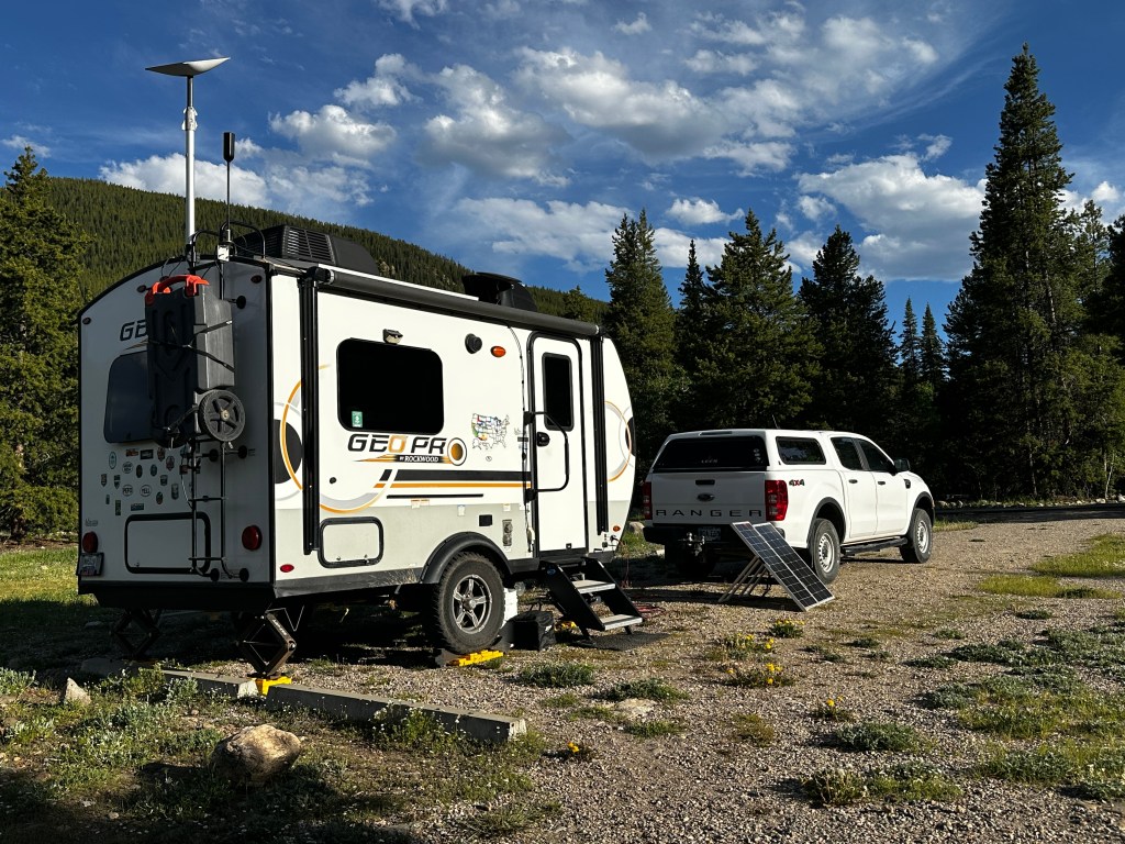 I spent five days in site #17 of Camp Hale. The campground is just over Tennessee Pass from Leadville. It is near the source of the Eagle River, which has usually been good fishing for Brown Trout. I set up on Sunday, Father’s day. There is no cell signal there, so I erected the Starling satellite dish in order to receive internet and telephone access. I also hung my hummingbird feeder so I would here their buzz each day.